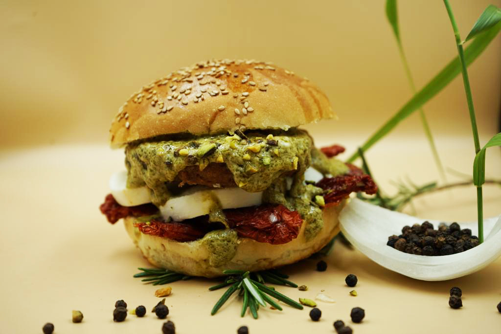 HAMBURGER, MOZZARELLA DI BUFALA, CREMA DI PISTACCHIO , POMODORINI SECCHI