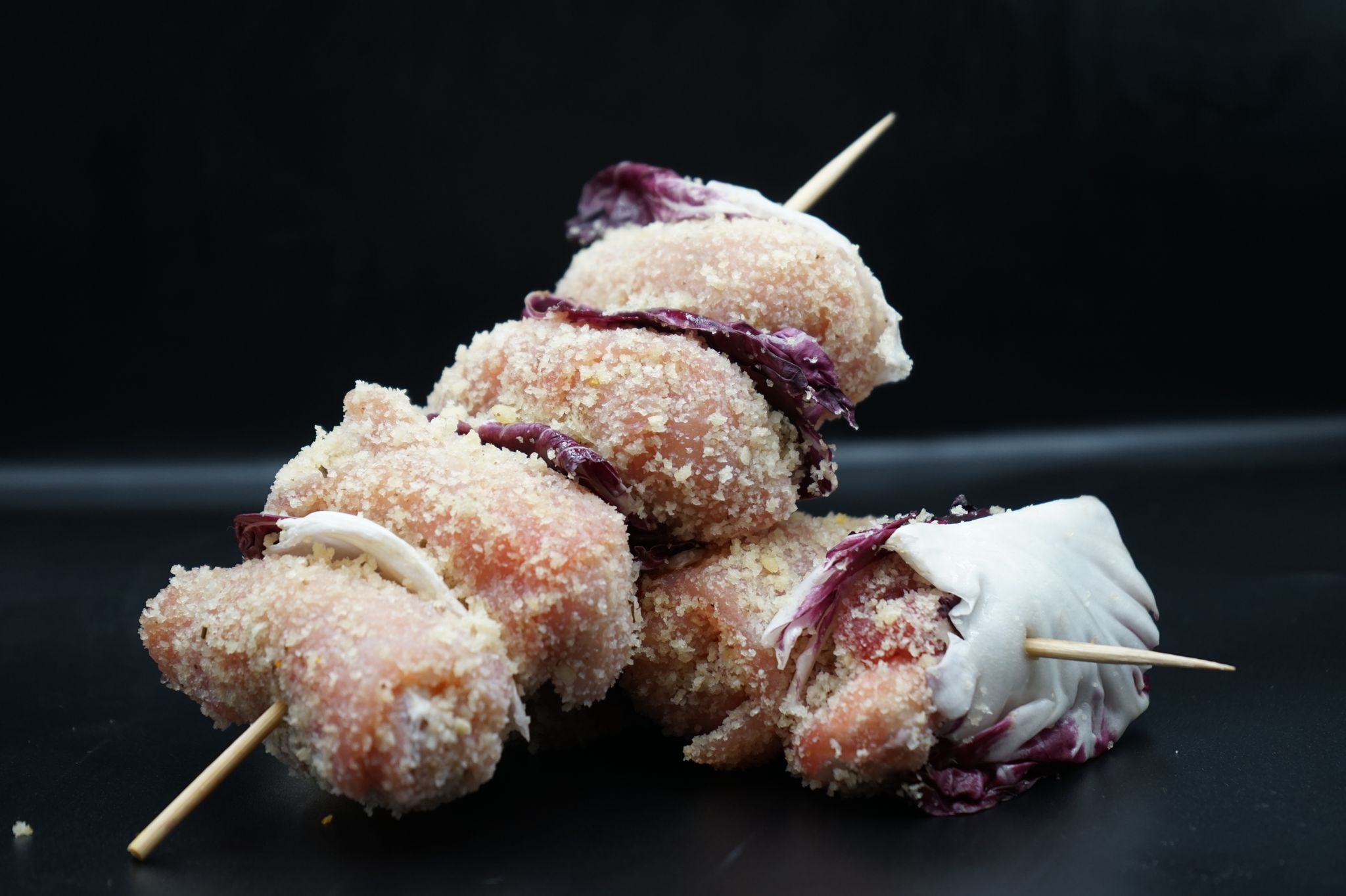 Si tratta di involtini di maiale battuti finemente, ripieni di grana, philadelphia speck e noci e panati esternamente.